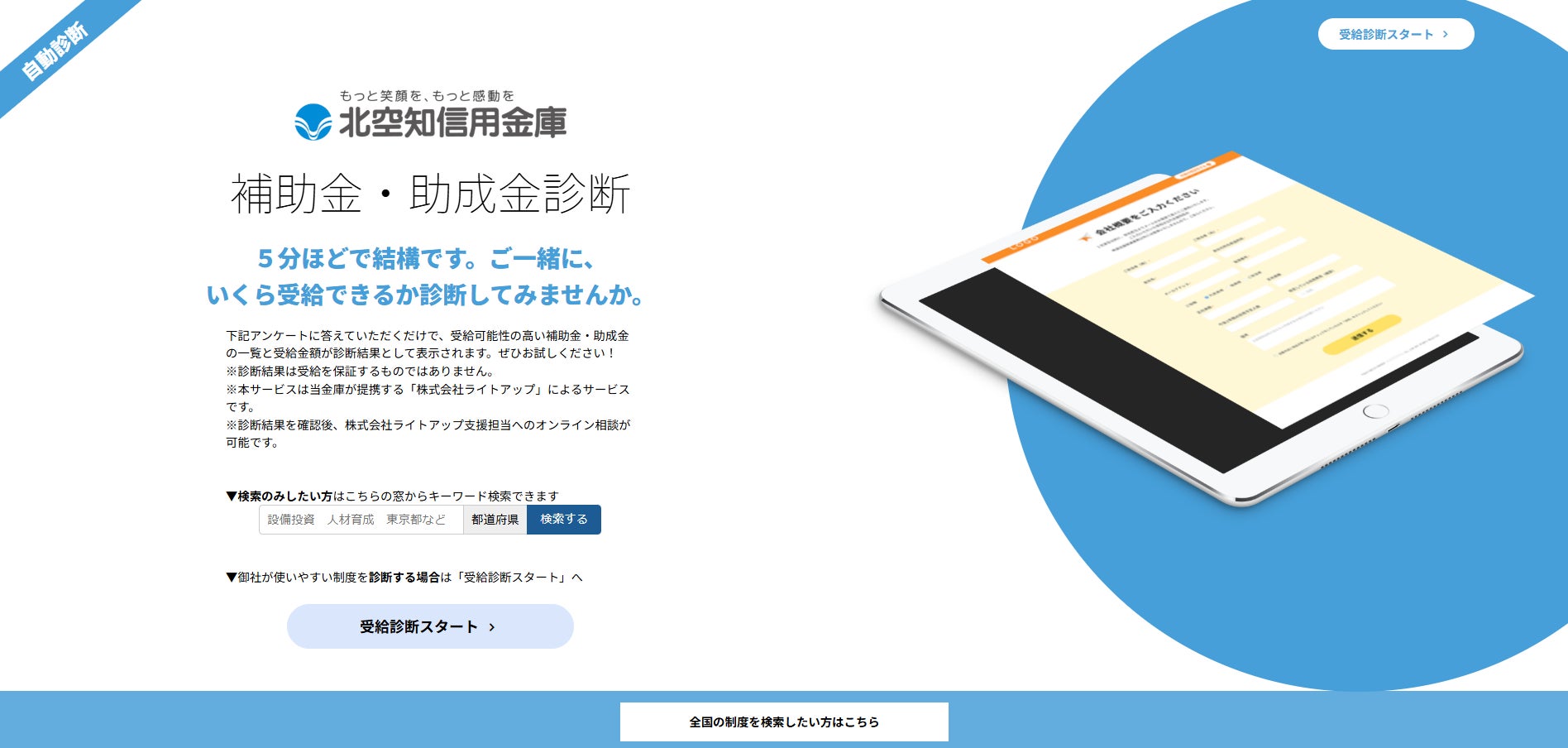 株式会社ライトアップ(本社:東京都渋谷区、代表取締役社長 白石崇、以下ライトアップ)は、北空知信用金庫(本店:北海道深川市、理事長 池内英二)と業務提携契約を締結し、補助金・助成金自動診断システム「Jシステム」の提供を開始いたしました。Jシステムの活用により、オンライン上でいち早く公的支援制度(補助金・助成金)の情報提供を行うことが可能となります。また、申請希望者はAIによる事業計画書作成支援や、申請手続きサポートをオンラインで受けることが可能となります。