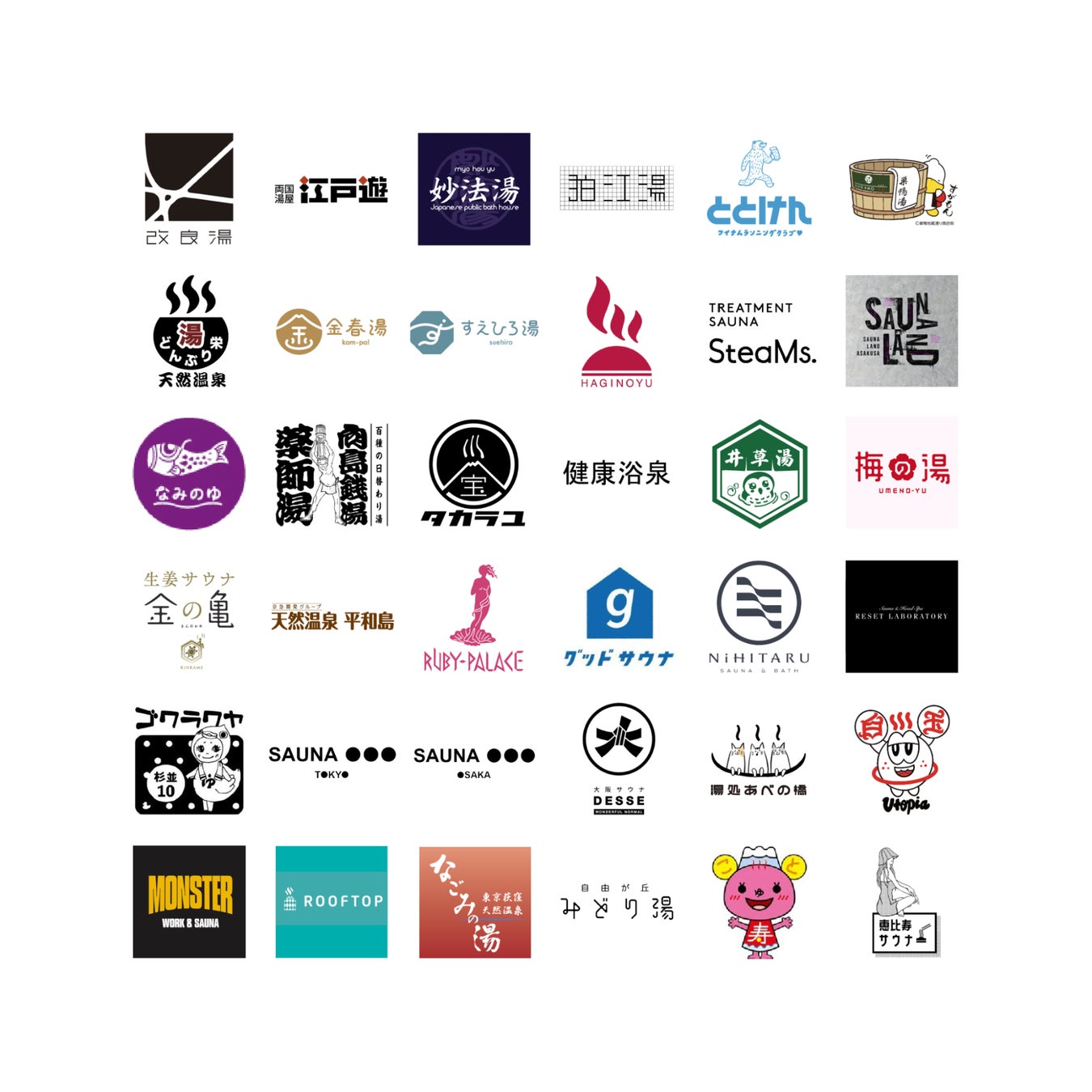 sauna&bath NiHITARU / 天然温泉 湯どんぶり栄湯 / 湯処あべの橋 / 改良湯 / 金春湯 / すえひろ湯 / 巣鴨湯 / 妙法湯/ 自由が丘 みどり湯 / 東京荻窪天然温泉 なごみの湯 / SAUNA OOO OSAKA / SAUNA OOO TOKYO / SAUNALAND ASAKUSA / 東上野・寿湯 / 狛江湯 / 健康浴泉 / 銭湯GOKURAKUYA / ユートピア白玉温泉 / 薬師湯 / RESET LABORATORY / 大阪サウナDESSE / 第二宝湯 / なみのゆ / 井草湯 / トリートメントサウナSteaMs. / ひだまりの泉萩の湯 / 荒川区 梅の湯 / ルビーパレス / 生姜サウナ金の亀 / グッドサウナ日本橋 / goodroom residence 学芸大学 / ととのい研究所(ととけん) / 天然温泉平和島 / 両国湯屋江戸遊 / 恵比寿サウナー / MONSTER WORK & SAUNA / ROOFTOPsauna (※順不同)