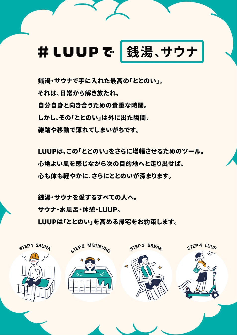 今回は、第五弾キャンペーンとして、銭湯やサウナからLUUPで帰ることにフォーカスした「LUUPで帰ろうキャンペーン」を実施します。LUUPは「ととのい」を増幅させるためのツールにもなります。お風呂上がりにLUUPで帰ることで、心地よい風を感じながら、心も体も軽やかに、さらに「ととのい」を深めることができます。ぜひ、お近くの銭湯やサウナに行った後にLUUPで帰り、「ととのい」が深まる感覚を味わってください。