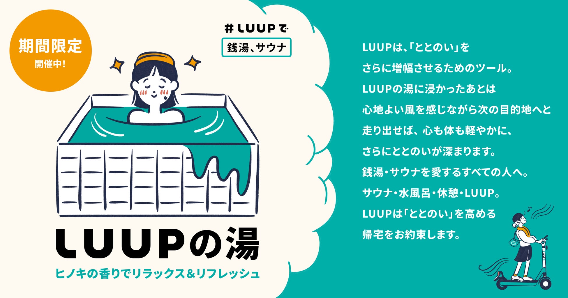 心地よい風を感じながら移動できる気持ちよさと、LUUPのブランドカラーを表現した特別な替わり湯「LUUPの湯」が一部施設に期間限定で登場します。ヒノキの香りでリフレッシュ&リラックスして、LUUPの帰り道をお楽しみください。