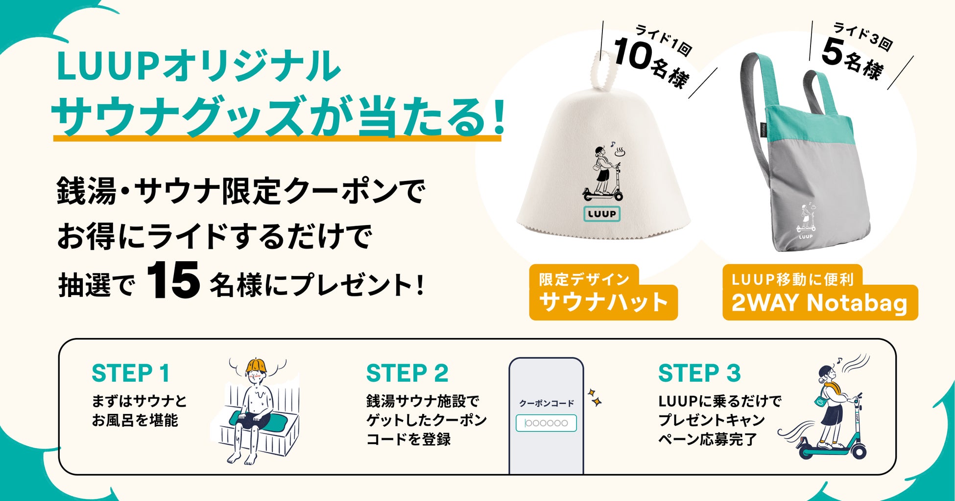 〜対象の銭湯・サウナ施設でクーポンをプレゼント!ライドした人の中から抽選でLUUPオリジナルグッズが当たる!〜