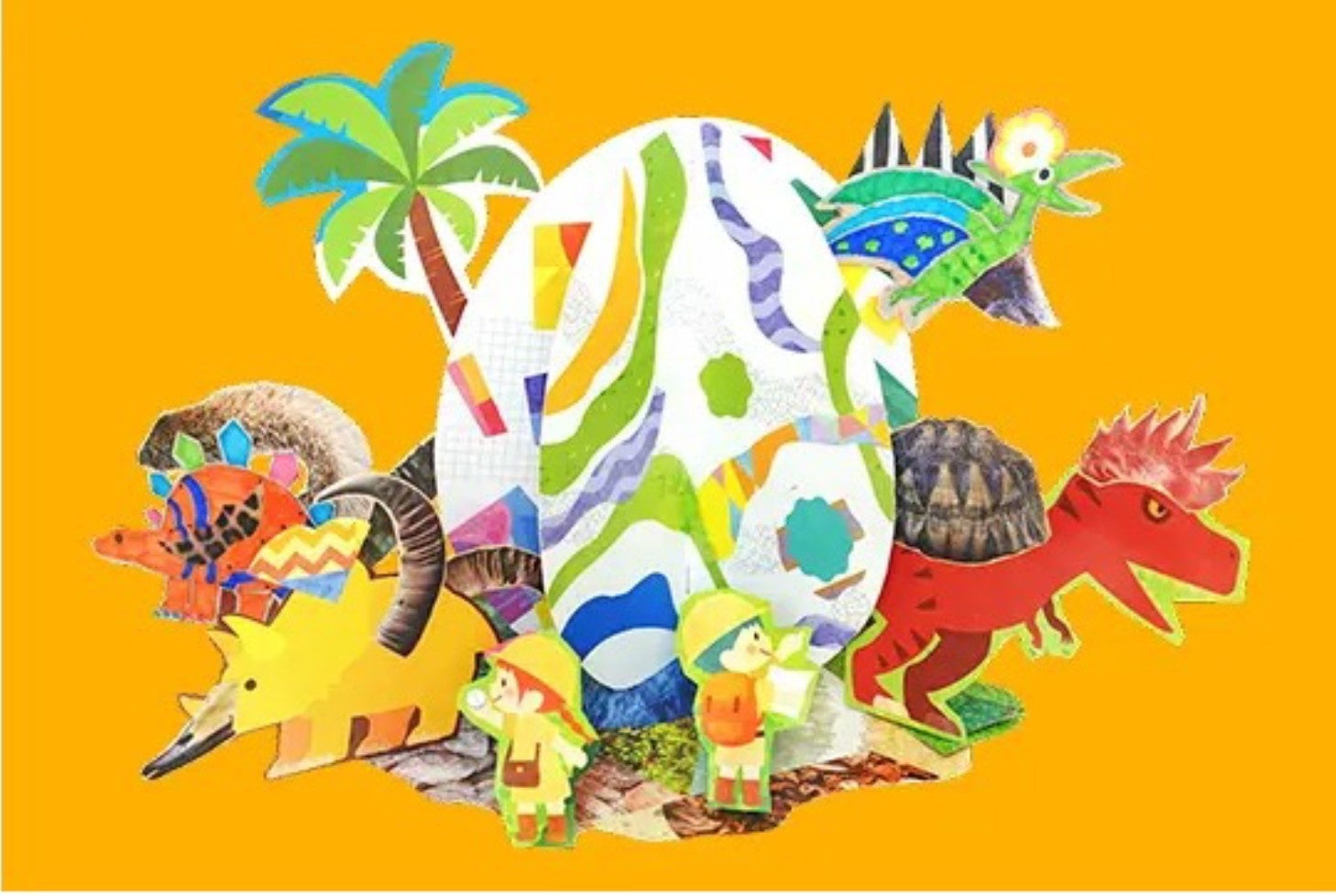 卵の形をベースに恐竜デザインのパーツを切り貼りして、自分だけのオリジナルの工作ブックを作れます。完成したブックを開くと、立体オブジェのような太古の世界が広がります。