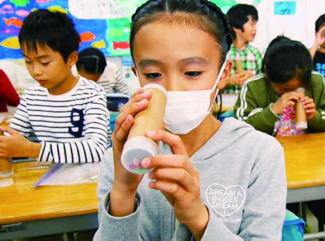 みなとみらいの海で回収したマイクロプラスチック(=細かく砕けてしまったプラスチック)で、万華鏡を作ります。海外に散乱していたごみが美しいデザイン模様に大変身します。
