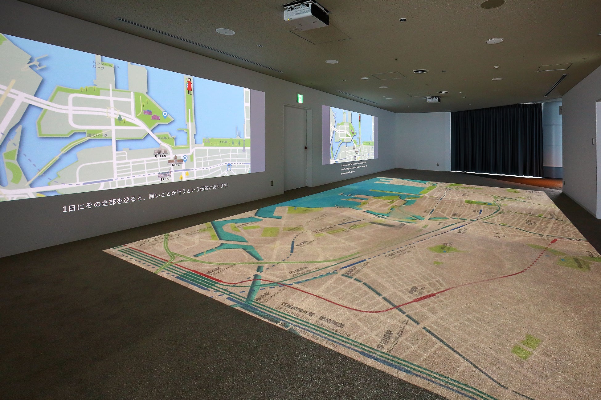 横浜の街が床や壁に投影された空間に足を踏み入れると、横浜発祥の地、現代の観光スポット、歴史的建造物、横浜ゆかりのヒーローなどが姿をあらわします。多層的に重なる横浜の歴史と文化をインタラクティブな体験を通して、小さな子どもから訪日観光客まで幅広い方々に楽しんでいただけます。
