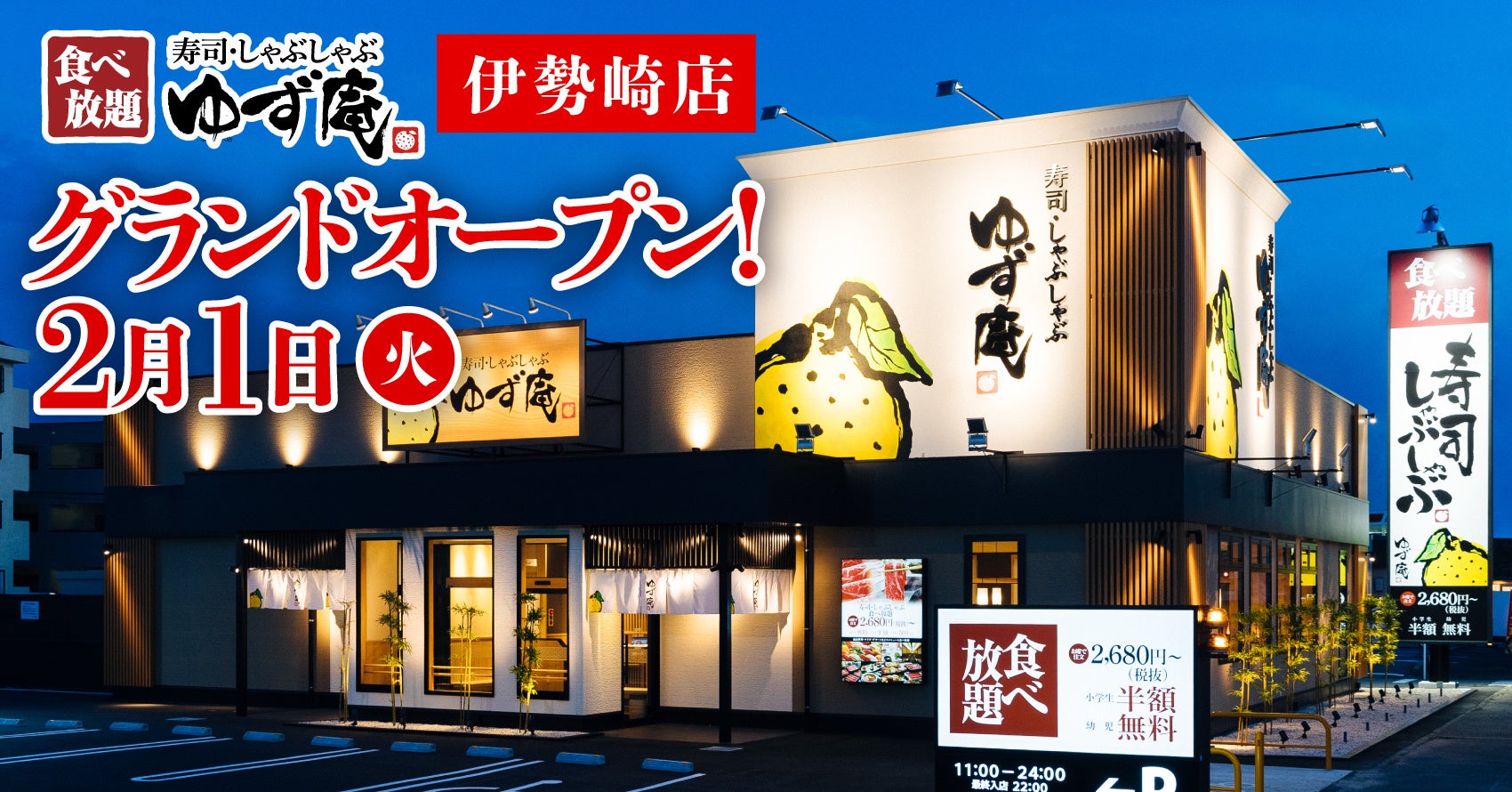 株式会社物語コーポレーション(本社:愛知県豊橋市/代表取締役社長:加藤 央之)が展開する『寿司・しゃぶしゃぶ ゆず庵』は、全国92店舗目の『寿司・しゃぶしゃぶ ゆず庵 伊勢崎店』(群馬県伊勢崎市)を、2022年2月1日(火)にグランドオープンいたします。