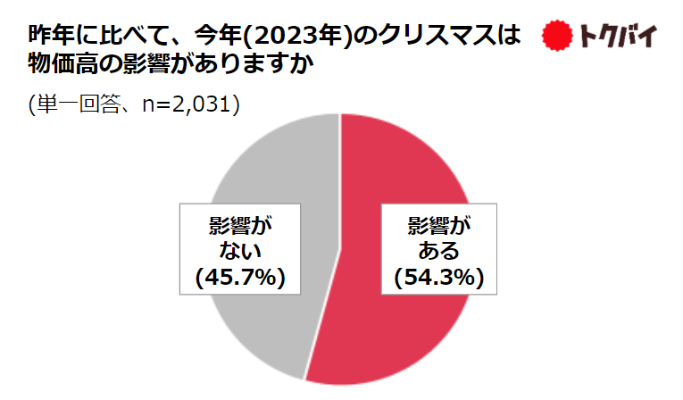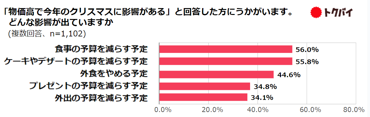 1. 半数以上が続く物価高でクリスマスに「影響がある」と回答、具体的には「食事の予算を減らす予定」56.0%、「ケーキやデザートの予算を減らす予定」55.8%など経済的な影響大