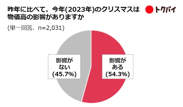 物価高による今年(2023年)のクリスマスへの影響についてたずねたところ、半数位以上が「影響がある」と回答しました。具体的な理由として、「食事の予算を削減する予定」56.0%、「ケーキやデザートの予算を削減する予定」55.8%と、経済的な影響が大きいことがうかがえました。
