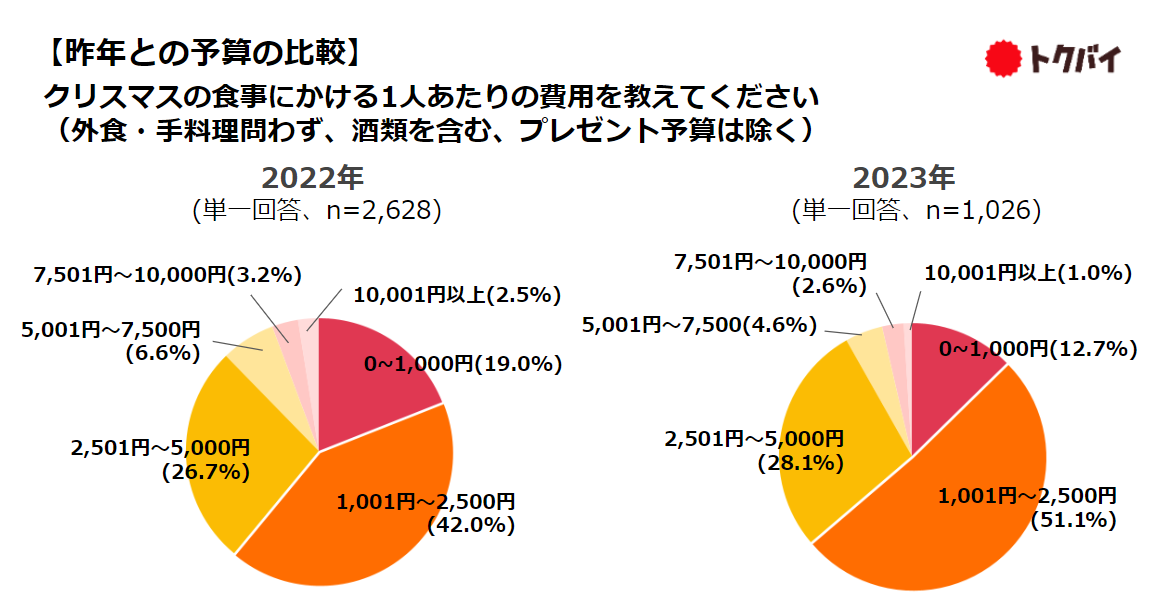 自宅・外食問わずクリスマスの食事にかける予算を昨年と比較すると、2,500円以下の回答の割合が約6割と、大きな変化は見られませんでした。物価高によりクリスマスにかける予算を削減する傾向にある中でも、実際の予算を一定の額から減らすことは難しい様子がうかがえます。