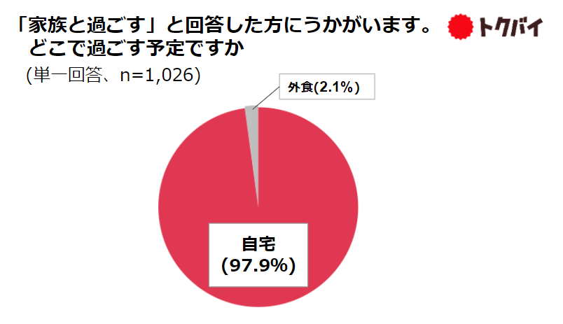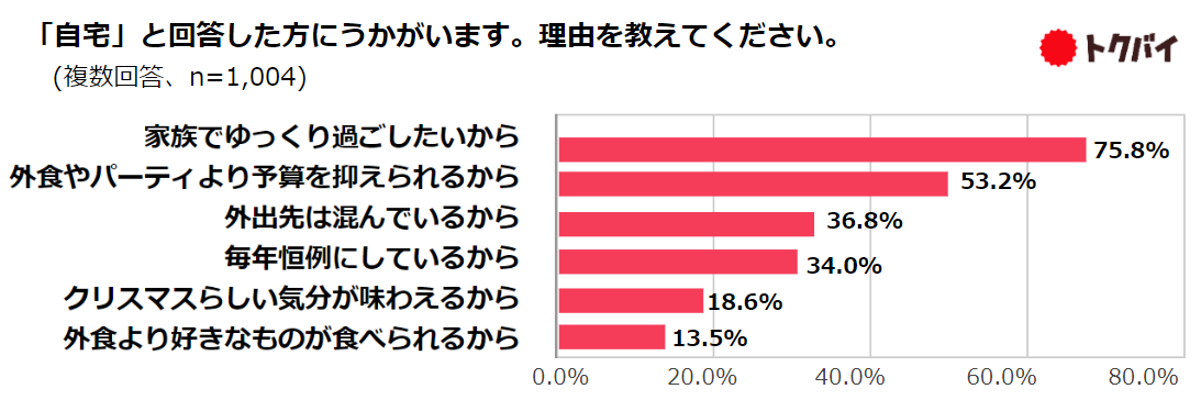 クリスマスの予定についてたずねたところ、「家族と過ごす」50.5%が最多となり、そのほとんどが「自宅」で過ごすことが分かりました。理由については、「家族でゆっくり過ごしたいから」75.8%、「外食やパーティより予算を抑えられる」53.2%となり、新型コロナウイルスの収束により外出や大勢での会食等が再び可能になったものの、多くの人が支出を抑えつつ家族とゆっくり過ごしたいと考えていることが分かりました。