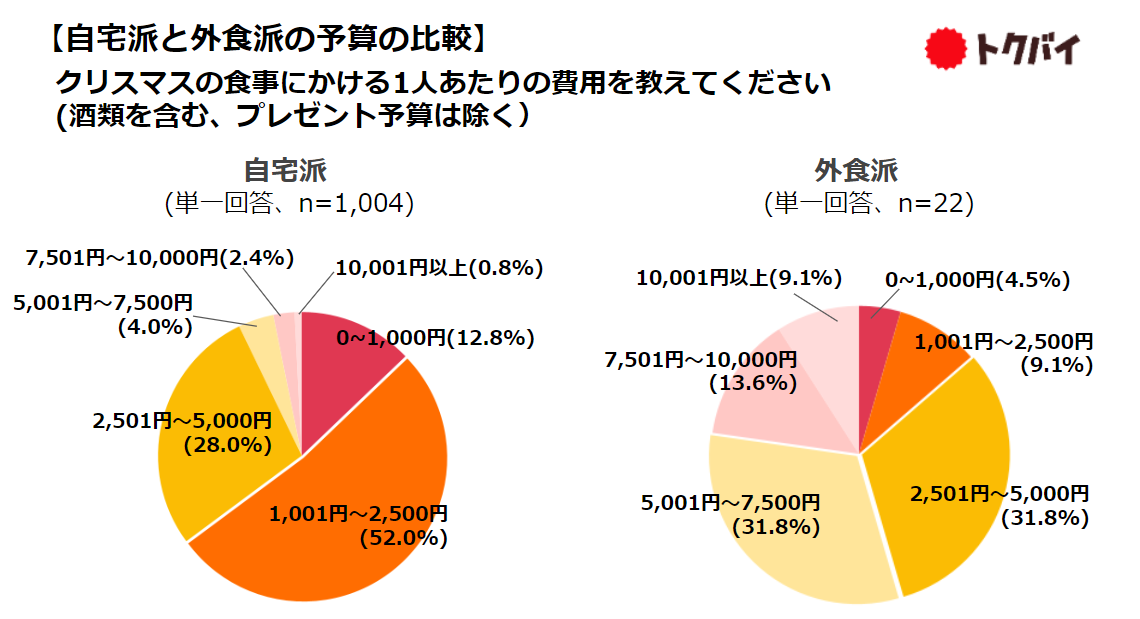 クリスマスの食費(1人あたり)について、自宅派の支出は「1,001円~2,500円」52.0%が最も多く、外食派は「2,501円~5,000円」および「5,001円~7,500円」がどちらも31.8%で並びました。それぞれの平均金額は自宅派「約2,300円」、外食派「約5,400円」と約3,000円の差がありました。