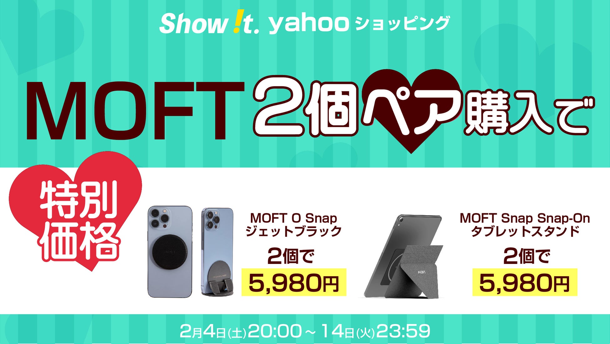 Yahoo「Show !t」はMOFTスマホスタンドもしくはタブレットスタンドをペアでお得なセール価格で販売、さらに2月4日(土)~14日(火)までポイント10倍プレゼントを実施