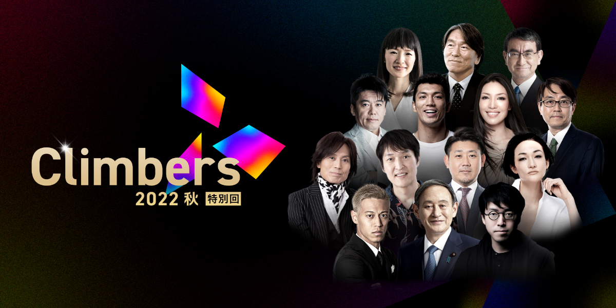 2022年11月19日(土)は、「Climbers LIVE」と称して、研究者/実業家の成田 悠輔氏や国民民主党代表 衆議院議員の玉木 雄一郎氏など総勢10名が登壇します。それぞれの分野の第一線で活躍するトップランナーたちが、どのように壁を乗り越え挑戦してきたのか、ここだけでしか聞くことのできない人生の特別講義をライブ配信でお届けします。