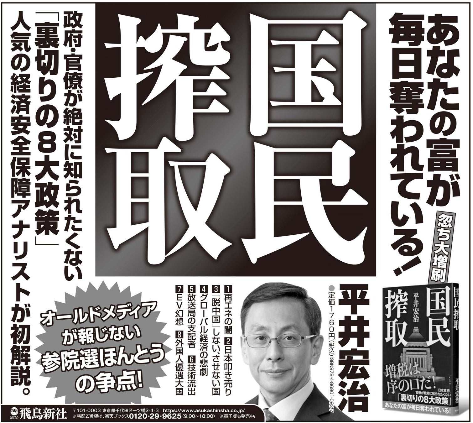株式会社飛鳥新社(本社:東京都千代田区、代表取締役社長:土井尚久)より7月2日に発売となった『国民搾取』は、政府・官僚が絶対に知られたくない「裏切りの8大政策」を人気の経済安全保障アナリスト・平井宏治氏がはじめて徹底解説した一冊。発売即重版がかかるなど、参院選のほんとうの争点としても話題になっています。