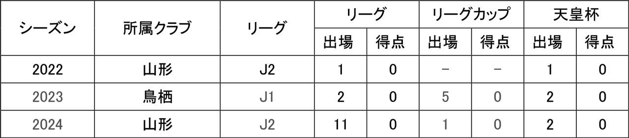 所属歴/西宮SS – セレッソ大阪西U-15 – 興國高 – モンテディオ山形 – サガン鳥栖 – モンテディオ山形