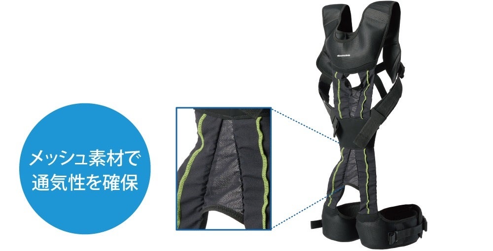 本体の一部にメッシュ素材を使用し、身体への接触面が少ないため長時間の使用でも蒸れにくくなっています。Lサイズの総重量は驚きの約450g*!500mlのペットボトルよりも軽く、長時間装着しても負担を感じにくいアシストスーツです。