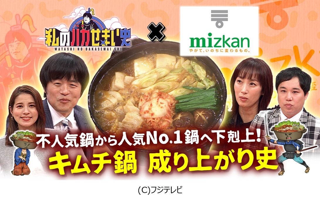 株式会社Mizkan(本社:愛知県半田市、代表取締役社長兼CEO:吉永智征、以下ミツカン)は、株式会社フジテレビジョン(本社:東京都港区台場、代表取締役社長:港浩一、以下フジテレビ)と共同で、2023年11月30日(木)~2024年2月29日(木)までの3ヶ月間、『私のバカせまい史』特別編、「不人気鍋から人気No.1へ下克上!キムチ鍋成り上がり史」を、TVer/FOD限定で配信いたします。