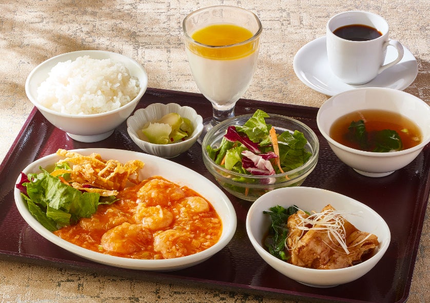 小エビと卵のチリソースと豚の角煮 杏仁豆腐、コーヒー付き 1,345円 (税込1,480円)