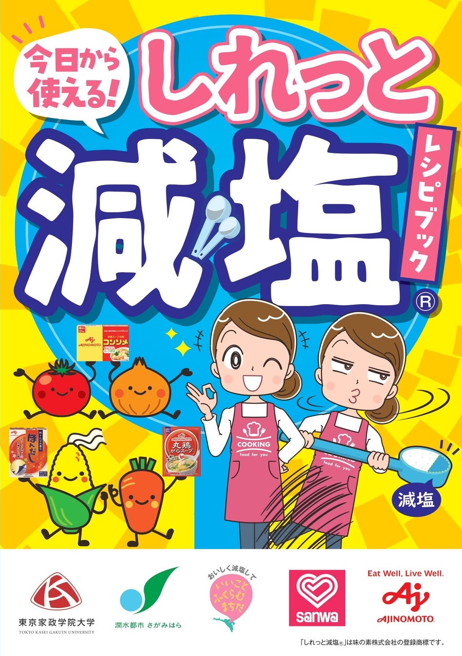 今回はその生活習慣病の予防にも役立つ「減塩」にフォーカスし、同様の取組を行っている町田市とともに、日本を代表する食品メーカーである「味の素株式会社」及びおもに管理栄養士を目指す学生が学ぶ「東京家政学院大学 食物学科」とのコラボレーションによる、無料配布の小冊子「今日から使える! しれっと減塩®レシピブック」を制作しました。