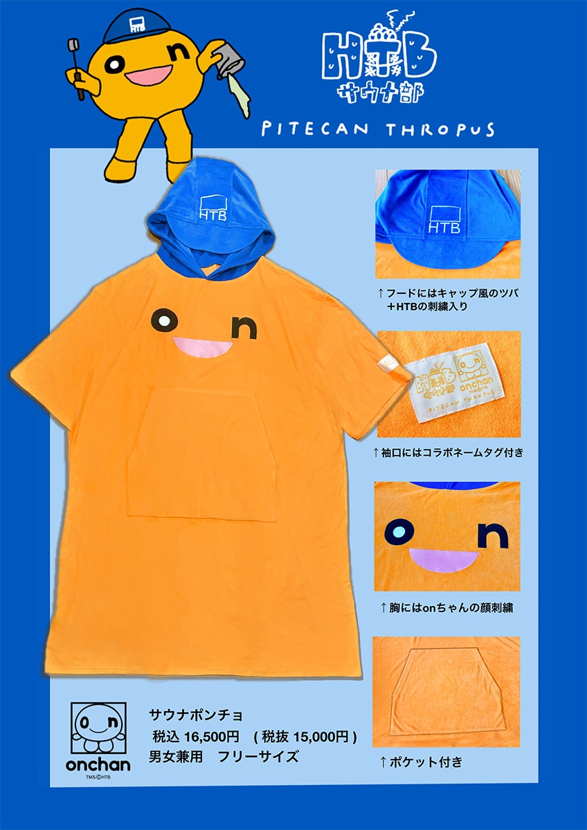 サウナグッズブランドPITECAN THROPUS × HTBサウナ部のコラボサウナポンチョが新発売! 着るとonちゃんになれるデザインです。外気浴中にonちゃん姿でととのえます!