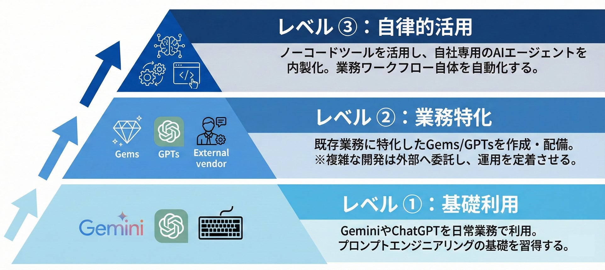 しかしこれは「企業に意思がない」のではなく、現場メンバー・経営チームが“AIを学ぶ時間そのものが無い”という構造的問題に起因しています。