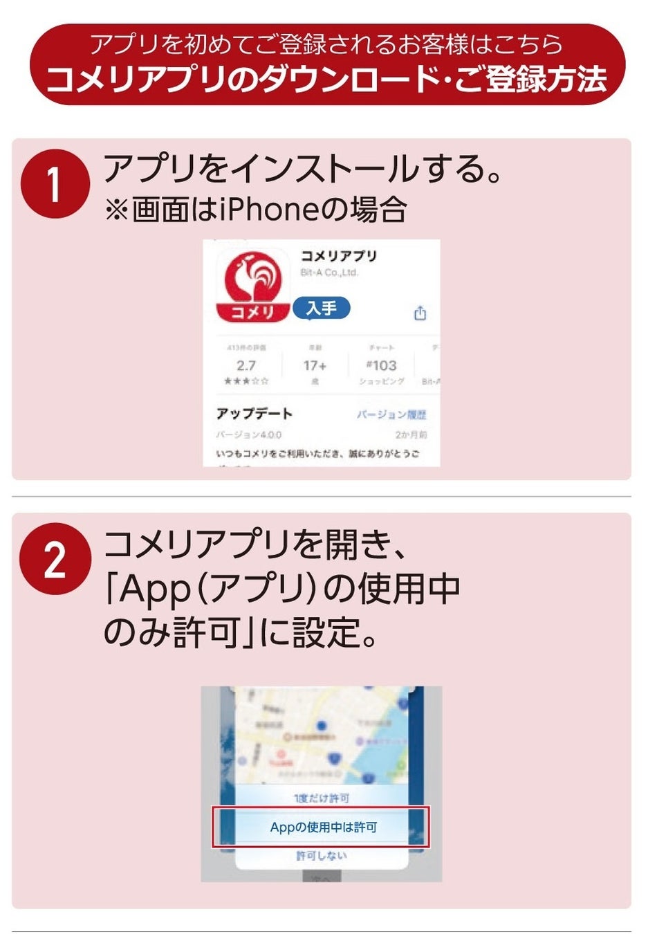 コメリアプリをダウンロードし、お手持ちのコメリカードまたは、アクアカードの情報をご登録いただくと、スマホひとつでスムーズにお会計ができます。もちろん通常通りコメリポイントも貯まり、貯まったポイントは、コメリ店舗およびコメリドットコムにて1ポイント=1円でいつでもご利用いただけます。コメリ店舗でのお買い物は、「コッコPay」がおすすめです。