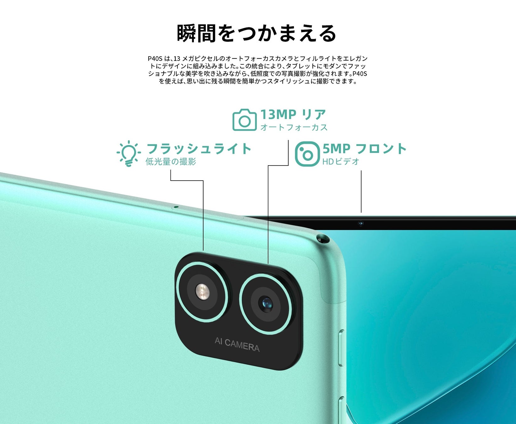 P40Sは、13メガピクセルのオートフォーカスカメラとフィルライトをエレガントにデザインに組み込みました。この統合により、タブレットにモダンでファッショナブルな美学を吹き込みながら、低照度での写真撮影が強化されます。P40Sを使えば、思い出に残る瞬間を簡単かつスタイリッシュに撮影できます。