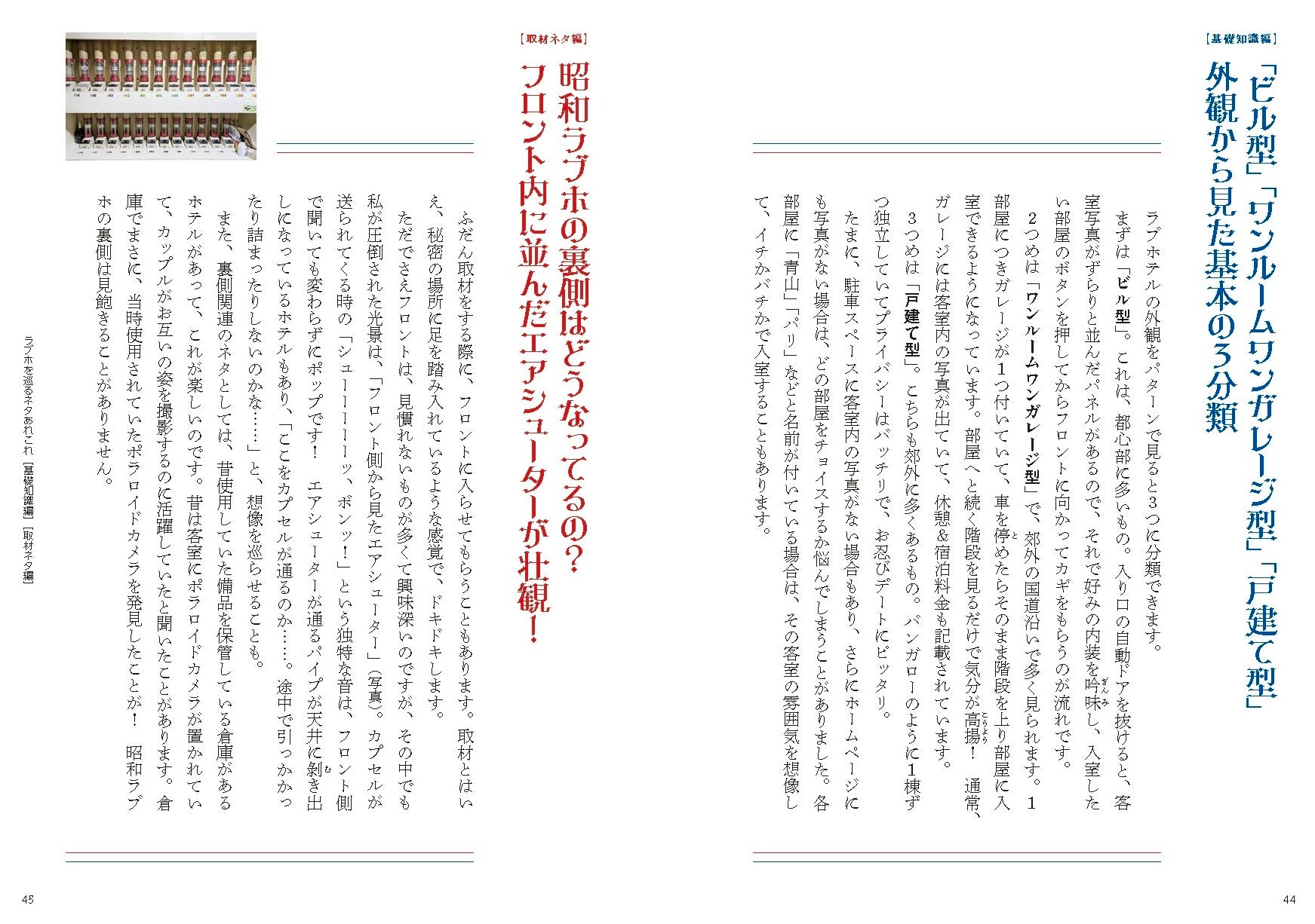 また、1985年の新風営法施行によって一変したラブホ業界の状況や、取材成功の鍵となる「オーナー様との信頼関係を築く方法」など、貴重な記録とノウハウが詰まった盛りだくさんの内容です。