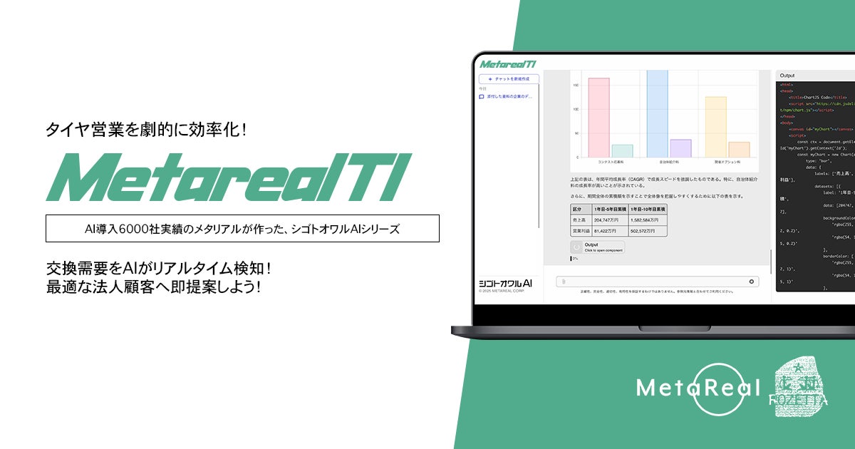 Metareal TIは、企業保有車両の運行情報や求人、天候・積雪予報、事故ニュースなどをAIで統合解析し、季節や走行状況に応じた法人向けタイヤ交換需要を予測するツールです。車種別の推奨タイヤ構成や見積もりも自動生成し、営業担当は即座に最適提案が可能です。