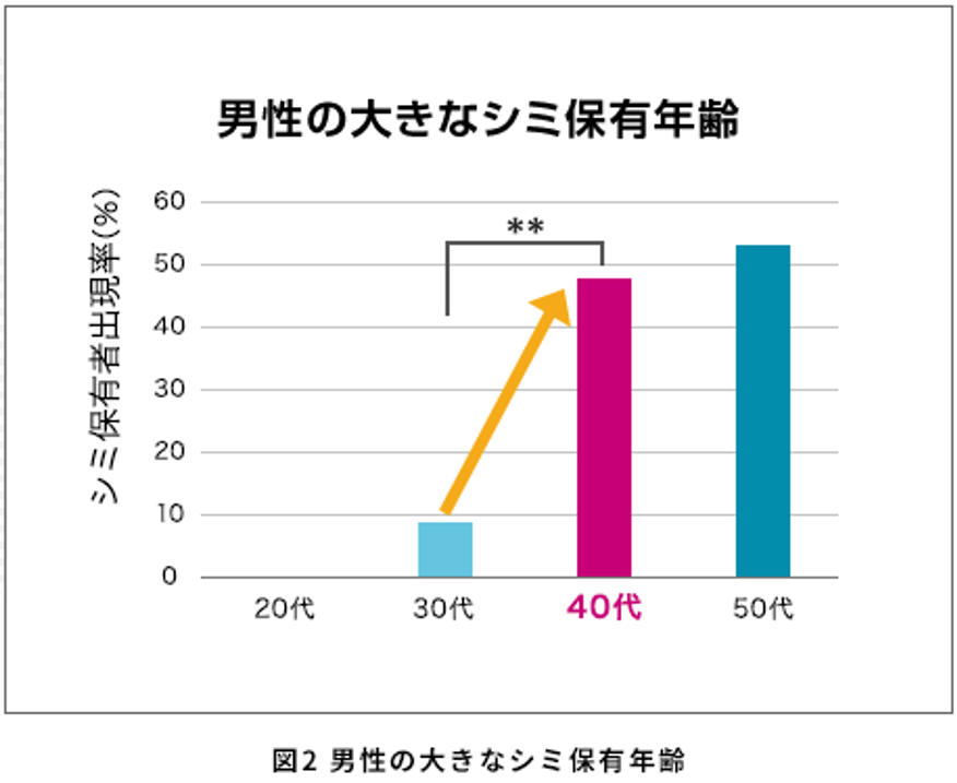 当社の研究により、男性のシミは40代から大きなものが顕在化し、シミの根が深くなる傾向が判明しました。未来のシミ対策※のために、早期のケアが重要です。