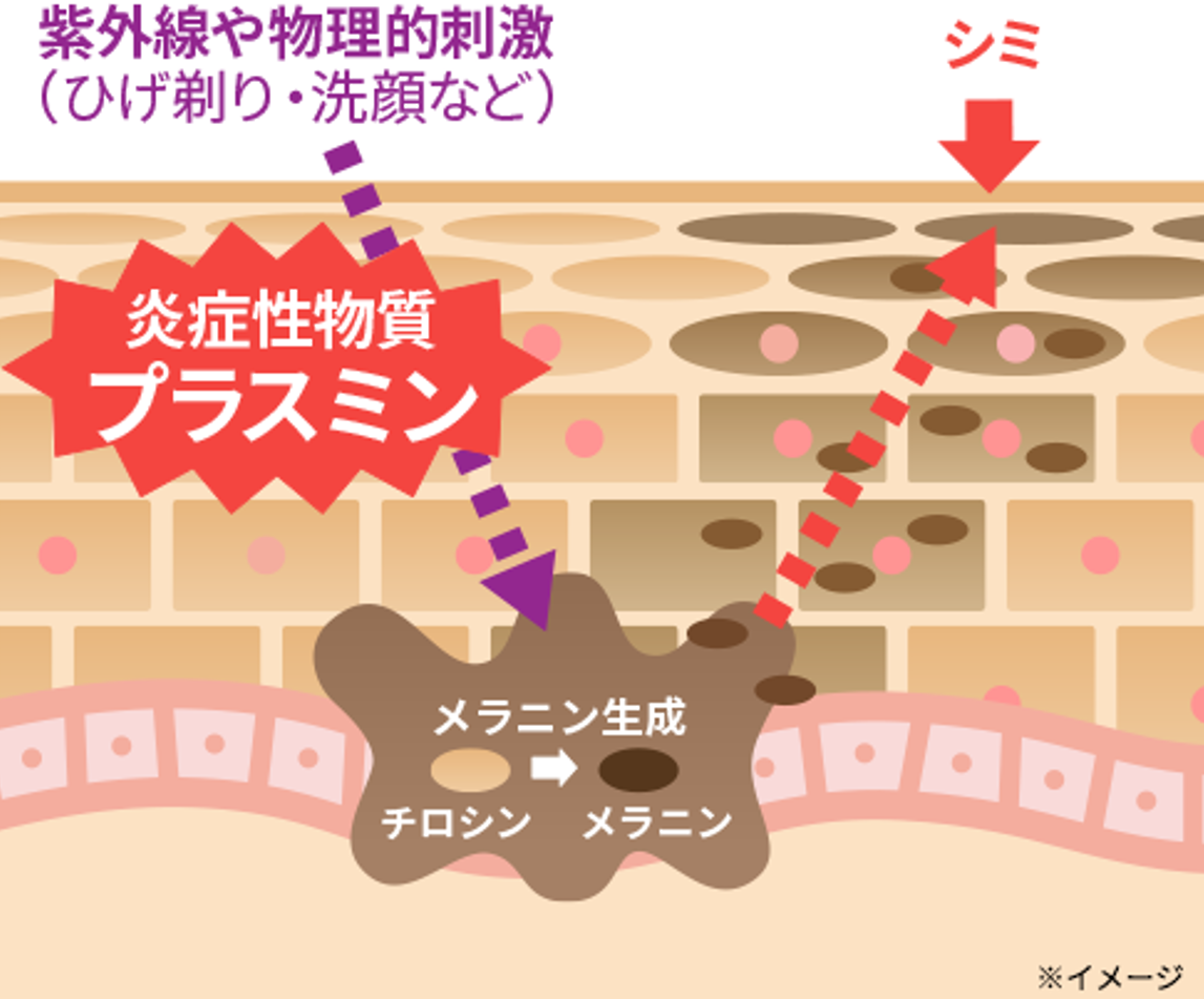 肌がダメージを受けて炎症が起こると、肌内部で「プラスミン」が活性化されます。これがメラノサイト(メラニンを作る細胞)に命令を出し続けることで、シミが次々と生成されます。男性の肌はヒゲ剃りや日焼け、ゴシゴシ洗顔などの物理的刺激を受けやすく、これらの刺激がシミ生成の命令物質「プラスミン」を常に活性化させることが要因です。