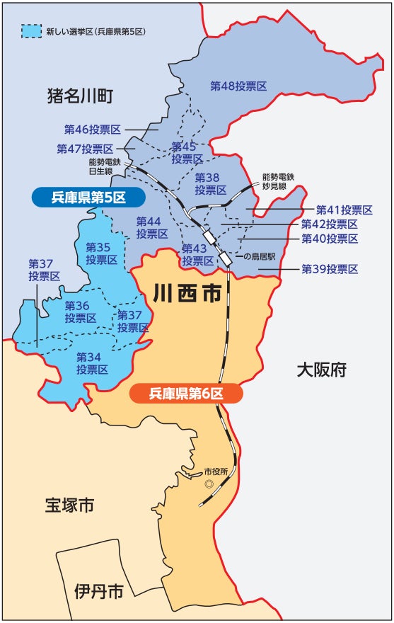 衆議院議員小選挙区において、1票の格差を是正するため、公職選挙法が改正され、平成29年7月から川西市は、兵庫県第5区と第6区の2つの選挙区に分かれました。