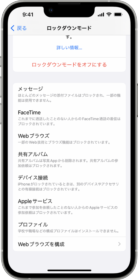 iPhoneでロックダウンモードを無効にする場合は次の手順で操作してください。