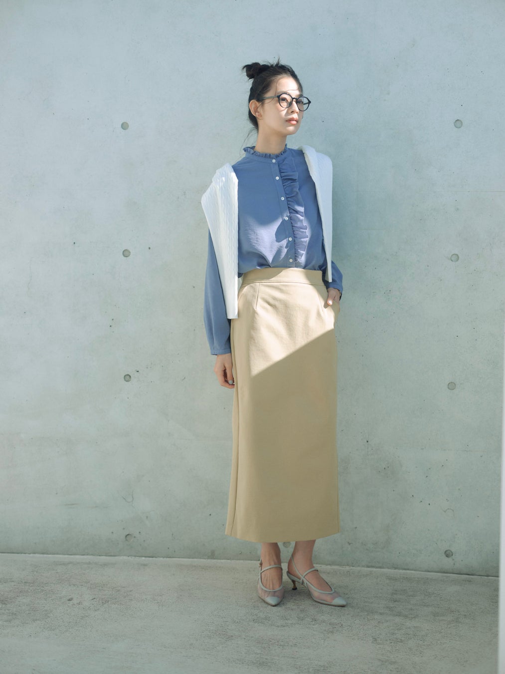 知的さと爽やかさを両立し、一瞬で「仕事の顔」を完成させる主役の一着。