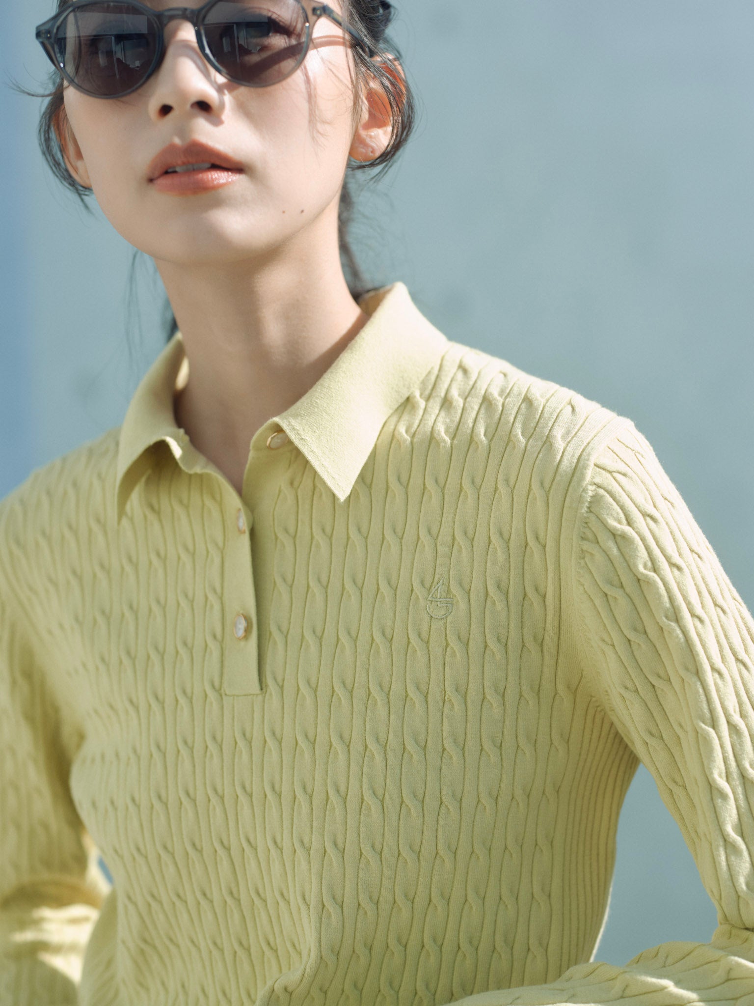 ケーブル編みの立体感と襟付きデザインが、知的なムードを加速させます。