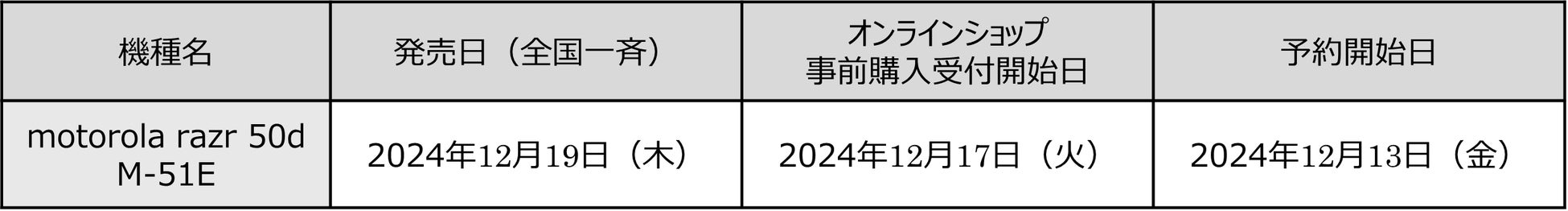 なお、「motorola razr 50d M-51E」の発売に併せたキャンペーンを2024年 12 月 19 日(木)から 2025年 1月31日(金)までの期間で開催いたします。キャンペーンの詳細は別紙をご確認ください。