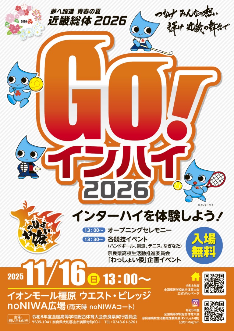 「近畿総体2026」の奈良県開催種目は「ハンドボール」「剣道」「テニス」「なぎなた」の4種目。奈々鹿は、奈良県高校生活動推進委員会「わっしょい倭(やまと)」とともに、大会を盛り上げるPR活動を実施します。