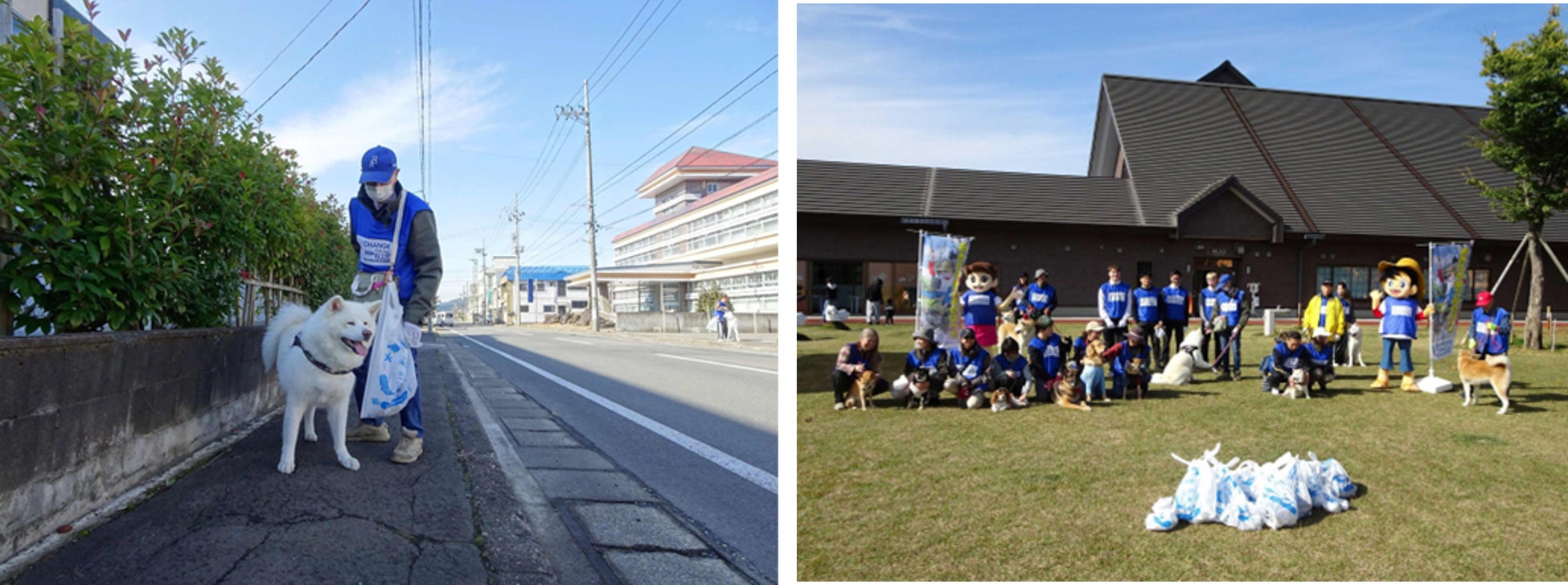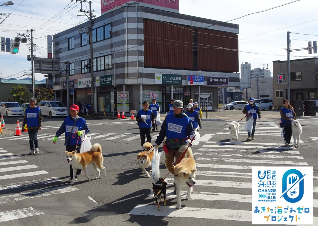 大館市観光交流施設「秋田犬の里」の協力により、大館市中心街を愛犬と一緒にごみ拾い活動を行いました。JR大館駅前の「秋田犬の里」を発着として、大館市の中心街を散歩しながら道路や側溝に落ちているごみを拾いました。7回目となる本イベントは、大館市の中心街で、CHANGE FOR THE BLUEの青いビブスを来た参加者と、秋田犬をはじめ様々な犬種15頭と行うことで、毎回道行く方々から大変注目を集めます。この愛犬とのごみ拾いイベントを目にし、犬のフンの処理と併せて目についたごみも拾って街をきれいにしようという習慣が浸透し、犬の散歩でごみ拾い運動が広がって欲しいと願います。