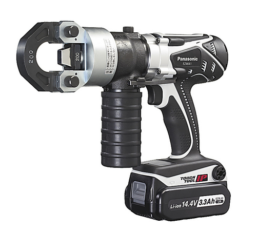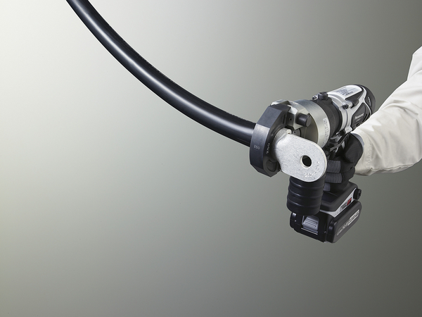 「充電圧着器」は、これまで12Vタイプのみでしたが、今回、リチウムイオン14.4Vタイプを開発。既発売の充電工具リチウムイオン14.4Vの電池パックの使用が可能になりました。また、CV線の圧着は、これまでの最大150m㎡より最大250m㎡まで可能になり、作業の幅が広がります。