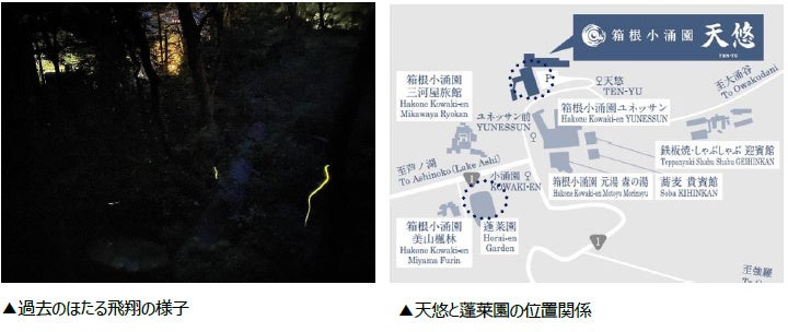 箱根小涌園 天悠(所在地:神奈川県足柄下郡箱根町二ノ平1297、支配人:柴田 訓 以下、天悠)から徒歩約10分の 場所に位置する箱根小涌園 蓬莱園(はこねこわきえん ほうらいえん)(所在地:神奈川県足柄下郡箱根町小涌谷503 以下、蓬莱園)では5月18日にほたるの飛翔を確認いたしました。蓬莱園で見られるほたるは自生しているほたるになり、今年は 例年より飛翔時期が早いように見受けられ、訪れるお客様の目を楽しませています。天悠ではご宿泊のお客様に、蓬莱園のほたる 鑑賞を楽しんでいただけますよう、ほたるの飛翔期間中は蓬莱園までの無料送迎をご用意いたします。