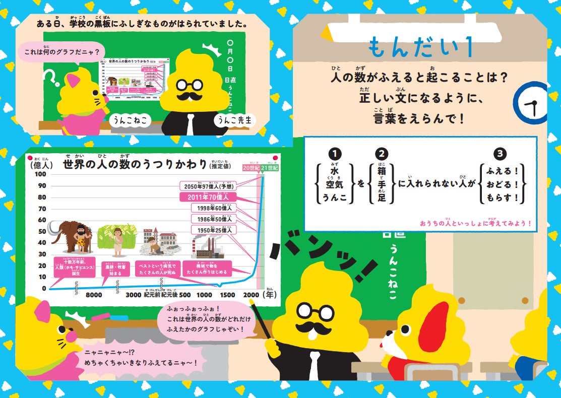 冊子では、学校の黒板に貼られた「世界の人の数のうつりかわり」のグラフを見たうんこねこが、うんこ先生に質問する場面からはじまります。