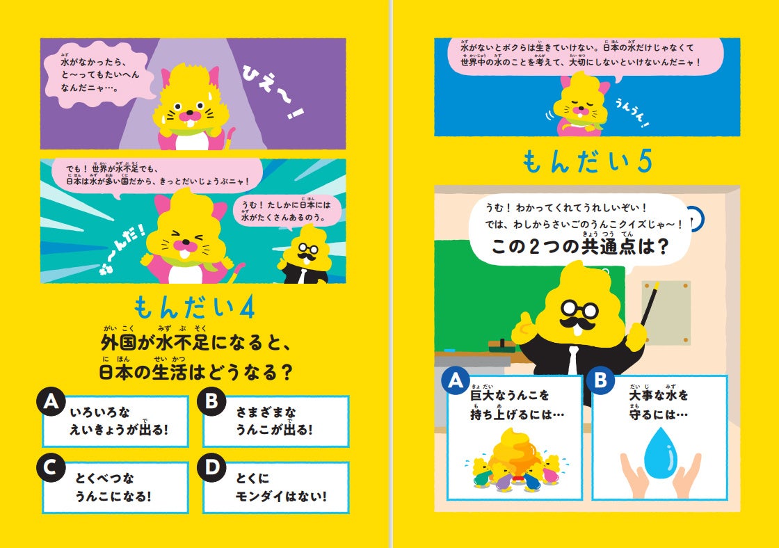冊子の内容はクイズ形式で全5問あり、うんこ先生から出題される水に関する問題をうんこねこが解いていくストーリー展開です。「うんこ」というキーワードがちりばめられたユーモアあふれるクイズの設問や選択肢はもちろん、シュールで可愛らしいイラストとテンポよく展開されるストーリーが、子どもの興味関心を惹きつけます。