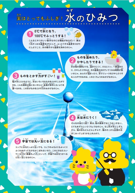 さらに「水のひみつ」のコンテンツでは、水に関するトリビアを5つ紹介しています。これを読んだ子どもたちが、いつか水博士になることを願っています。