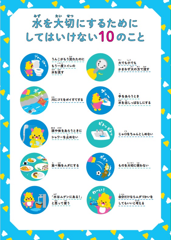 冊子の巻末では、「水を大切にするためにしてはいけない10のこと」という水を守るための具体的な取り組みを紹介。わかりやすく親しみやすいイラストで視覚的に見せることで、子どもがふだんの生活の中ですぐに実践できるような工夫がなされています。