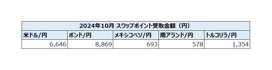 SBI FXトレード株式会社(本社:東京都港区、代表取締役社長:藤田 行生)は、2024年10月のスワップポイントの実績を公表しましたことをお知らせいたします。