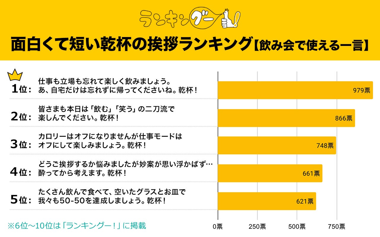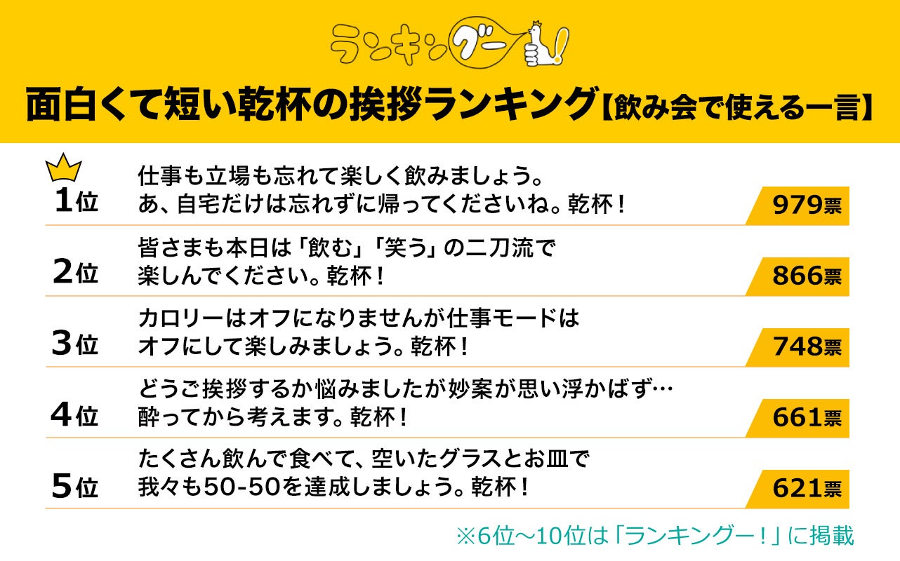 1位に選ばれたのは、「仕事も立場も忘れて楽しく飲みましょう。あ、自宅だけは忘れずに帰ってくださいね。乾杯!」。投票者からは「楽しい飲み会のスタートである乾杯にふさわしい」「あまり飲みすぎないで、という意味もアリですね」などのコメントが寄せられました。