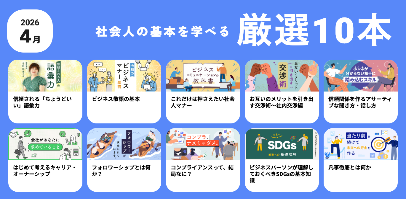 インターネットでの学びや教育を起点とした社会変革を行う株式会社Schoo(本社:東京都渋谷区、代表取締役社長CEO:森 健志郎、以下「スクー」)は、社会人向けオンライン学習サービス「Schoo」にて、社会人の基礎スキルが学べる授業の特集を公開いたします。特集内で紹介している授業は、すべて無料でご視聴いただけます。