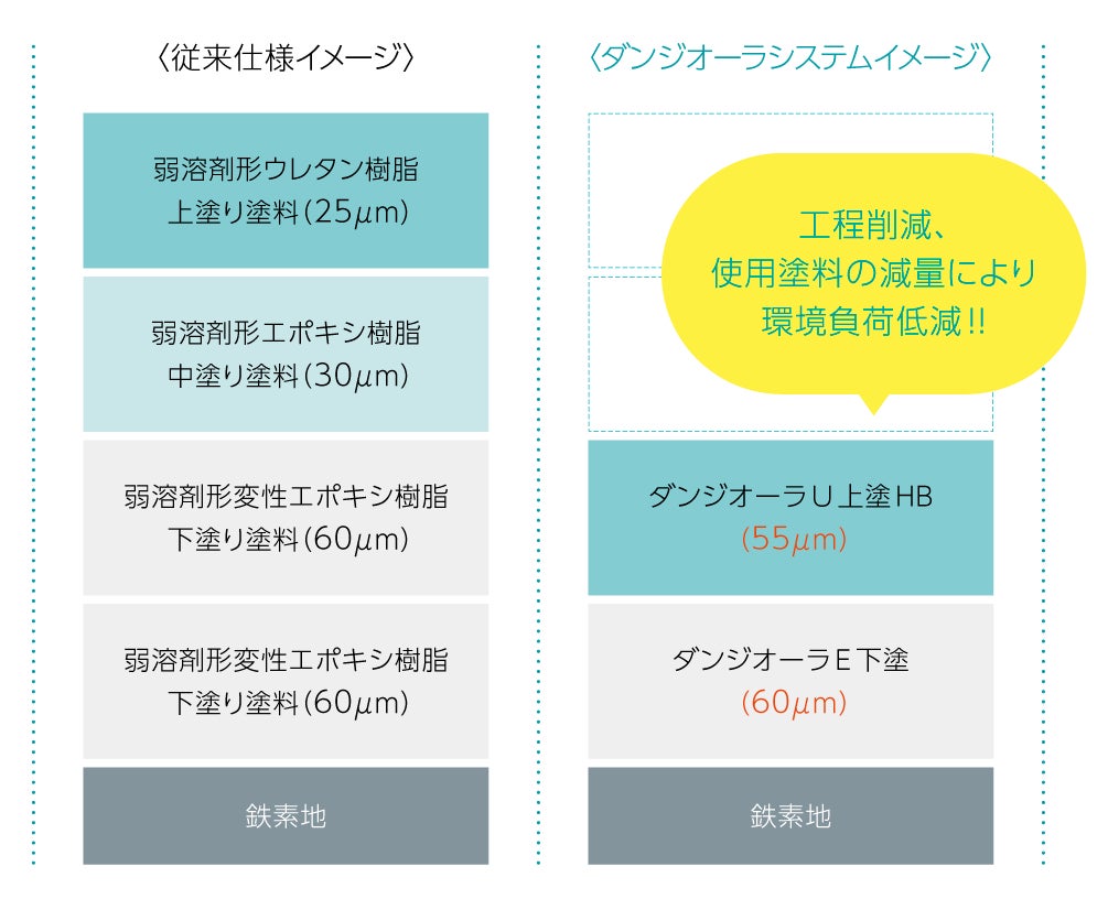 日本ペイント株式会社(本社:東京都品川区、社長:喜田益夫)は、10月29日より、重防食用分野で、さび面対応弱溶剤形高遮断性変性エポキシ樹脂下塗り塗料「ダンジオーラE下塗」(以下、本下塗り塗料)、高遮断性塗料用弱溶剤厚膜形ウレタン樹脂上塗り塗料「ダンジオーラU上塗HB」(以下、本上塗り塗料、上記2製品について以下、本システム)を販売開始しますのでお知らせいたします。本システムは、塗り替え周期延長とコスト低減への貢献を目指し開発した、「これまでの防食領域の常識を覆す」省工程塩害対策システムです。また、本下塗り塗料には株式会社京都マテリアルズ 代表取締役 山下正人氏(大阪大学招聘教授・工学博士)と協働開発した、「高防食高遮断・さび転換機能※1・残存塩分適性技術」が採用されています。