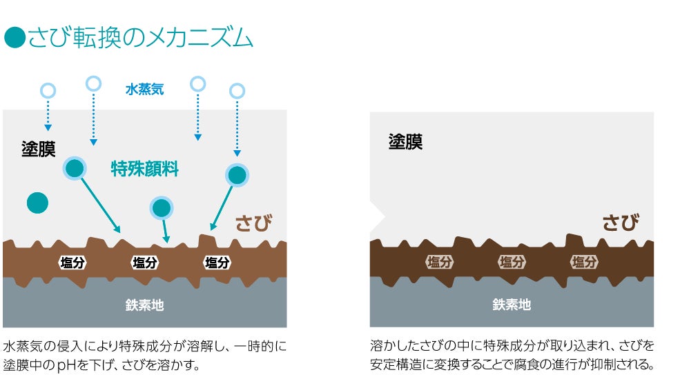 ※1:さび転換技術のメカニズム:さびには防食効果の高いものから低いものまでさまざまな種類が存在します。本下塗り塗料では、防食効果の高い特定のさびを多く生成させるための特殊成分を配合しています。この防食効果の高いさびは、防食効果の低いさびへ変化しにくく、さらに鉄の表面に存在することで、腐食の進行を抑制します。