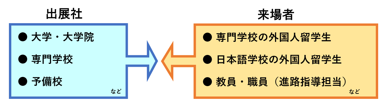 このたび、この2つの展示会にすでに来場されていた日本語学校・専門学校の外国人留学生・教職員の方々および業界関係者からの3つ目の支援の柱として、進学をテーマにした展示会を同時開催してほしいとの多くの要望をいただいておりました。