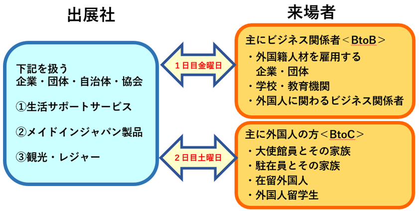 一方で、言語や文化の壁により、外国人の方々が日本での生活の様々な場面で不便を感じているのが現状です。そのような背景から、外国人向けの生活支援をコンセプトに、外国人向けのサービス・商品を提供する企業と、それらのサービスを必要としている日本在住の外国人やその家族と外国人雇用企業とのマッチングの場(BtoBtoCの専門展示会)として、2020年11月に第1回目を開催いたしました。以降毎年規模を拡大、2023年11月にいよいよ第4回目を開催いたします。